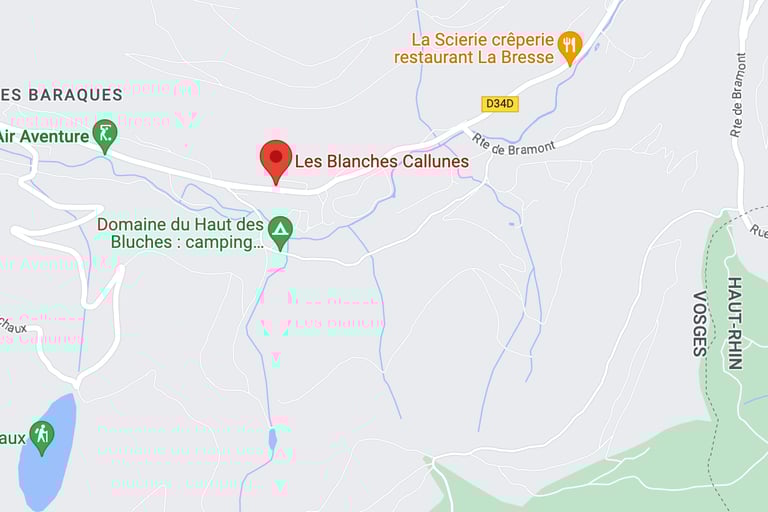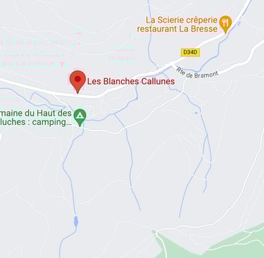 Nous sommes dans le Grand Est, c'est déjà un indice. Zoomons un peu, nous arrivons dans les Vosges. Les Hautes-Vosges se situent au Sud du département. Normal, plus on descend plus on monte, eh oui, plus on descend sur la carte plus on monte en altitude. Le village de La Bresse est à 635 mètres mais on peut monter beaucoup plus haut. Les Blanches Callunes sont à 760 mètres et à 4 kms du centre ville d'un côté et de la station de ski de La Bresse-Hohneck de l'autre.
