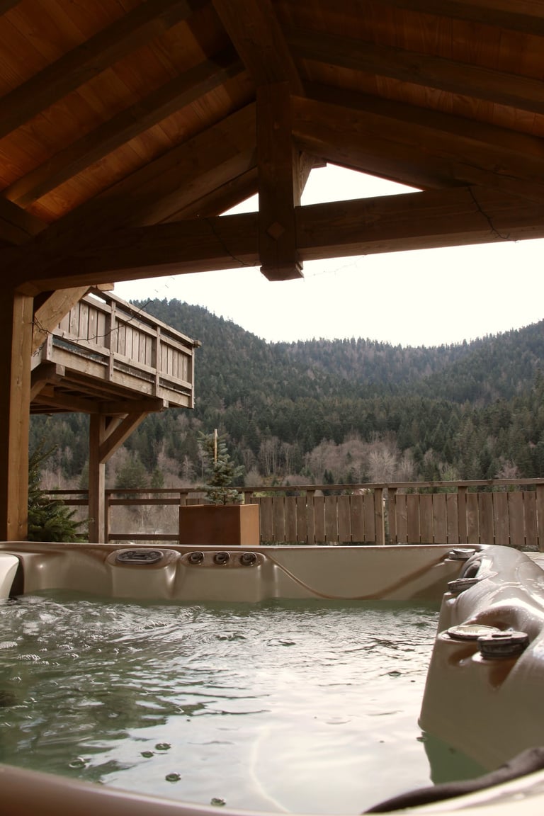 Face aux sapins verts ou blancs, le spa sous son abri vous enveloppe de sa chaleur. Il n'est pas encore programmé pour servir le champagne mais ses 38 degrés en font un bon allié pour se détendre et ne plus penser à rien.... Euh si à en sortir quand on a les doigts tout fripés...